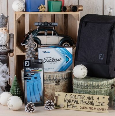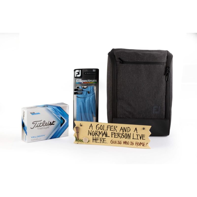Ja vēlaties pārsteigt savu golfa spēlētāju ar perfektu dāvanu, meklējiet tālāk – mūsu īpaši atlasītais dāvanu komplekts ir golfa piederumu kolekcija, kas izvēlēta, domājot par golfa spēlētājiem. Šajā komplektā ir iekļauti tādi kvalitatīvi priekšmeti kā Footjoy Spectrum cimds, ducis Titleist Velocity golfa bumbiņu, Footjoy apavu soma un unikāla koka golfa plāksnīte, un tas ir ideāls praktiskuma un elegances apvienojums.