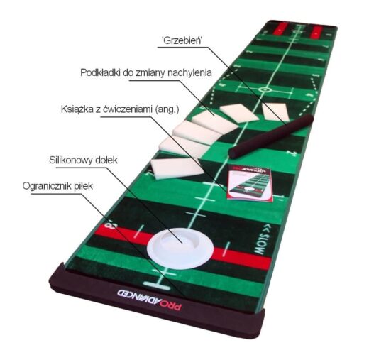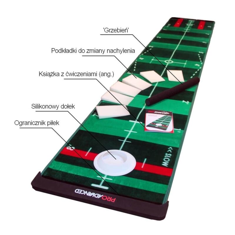 Ātrumu nosaka paklāja poliestera šķiedru suku birstīšanas veids. Šķiedru augstumu var regulēt pats, izmantojot īpašu “ķemmi”. Tas, vai šķiedras būs paklāja virzienā vai pretējā virzienā, ir atkarīgs no jums. Šim golfa treniņu palīglīdzeklim ir pievienots arī caurums, kas izgatavots no silikona un kuru var brīvi izvietot pa visu paklājiņu. Jums ir 6 putuplasta ķīļi, lai izveidotu savu bremzēšanas konfigurāciju. Ir arī redzama bumbiņas izsekošanas tehnoloģija (bumbiņa atstāj pēdas uz paklāja), kas palīdzēs jums vēl vairāk uzlabot savu spēli. Ar īpašu ķemmi atkal tiek noņemtas bumbiņu pēdas.