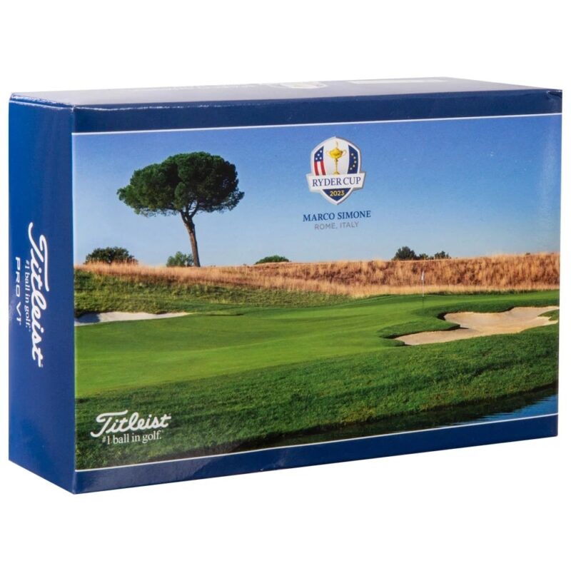 Golfa bumbiņas no oficiālās kolekcijas vienam no svarīgākajiem golfa turnīriem – 2023. gada Ryder Cup, kas šogad tiek izspēlēts saulainajā Marco SImone laukumā netālu no Romas. Unikālajā iepakojumā ar oficiālo Ryder Cup zīmolu un laukuma, kurā notiek turnīrs, fotogrāfiju ir sešas Titleist Pro V1 bumbiņas, uz kurām ir arī Ryder Cup logotips.