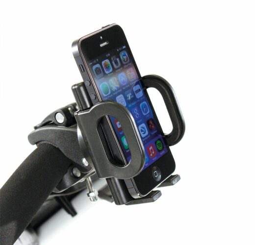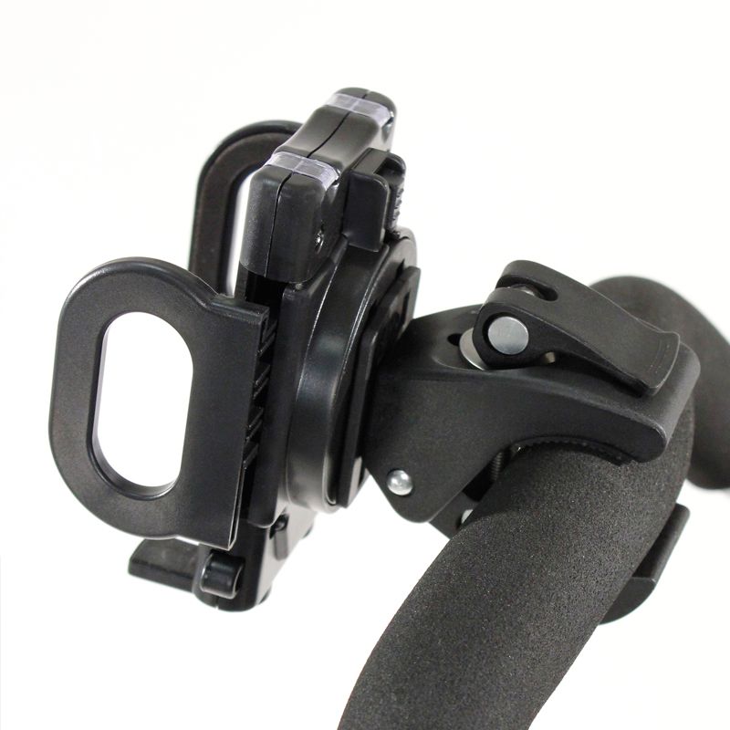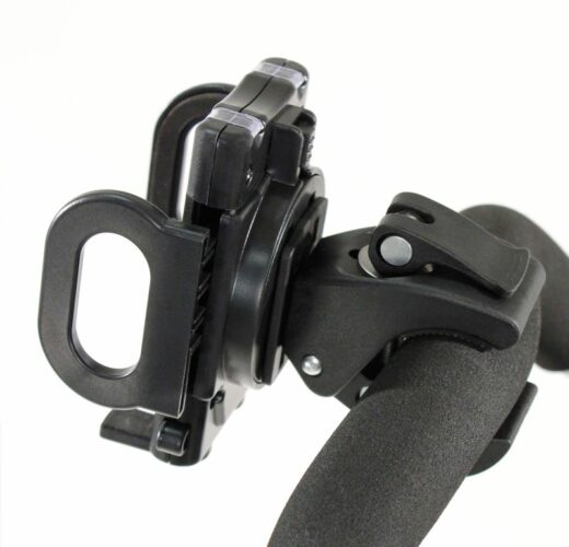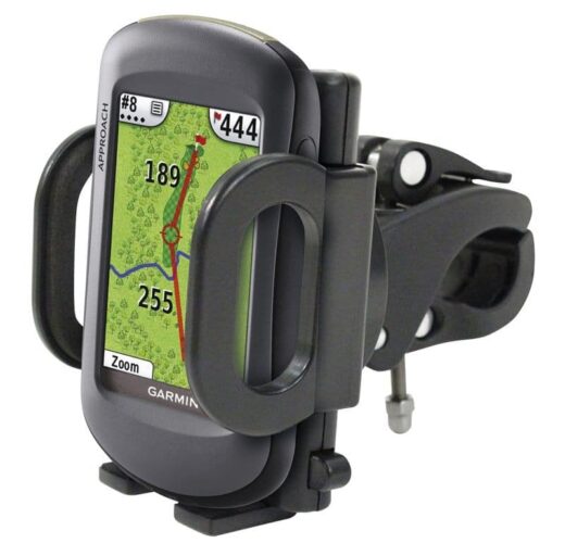 Universāls GPS vai mobilā tālruņa stiprinājums, kas paredzēts piestiprināšanai pie golfa ratiņu rāmja vai roktura.