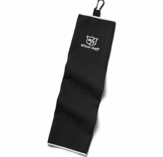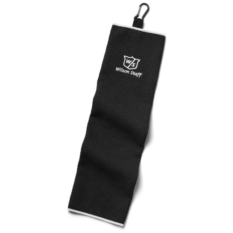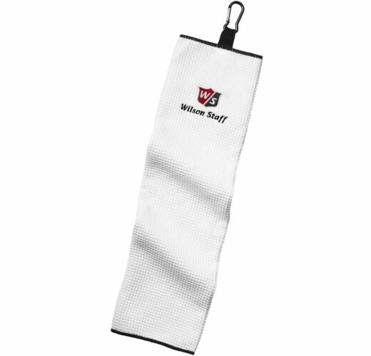 Oriģināls Wilson Staff golfa dvielis, trīs reizes salocīts, ar klipsi, kas paredzēta piestiprināšanai pie somas.